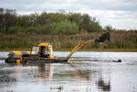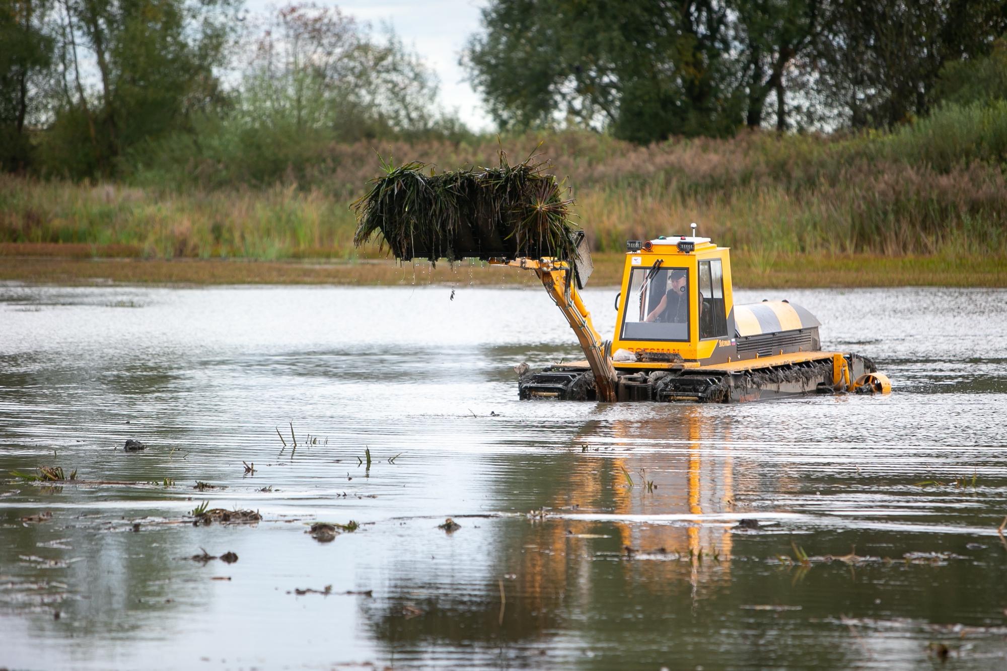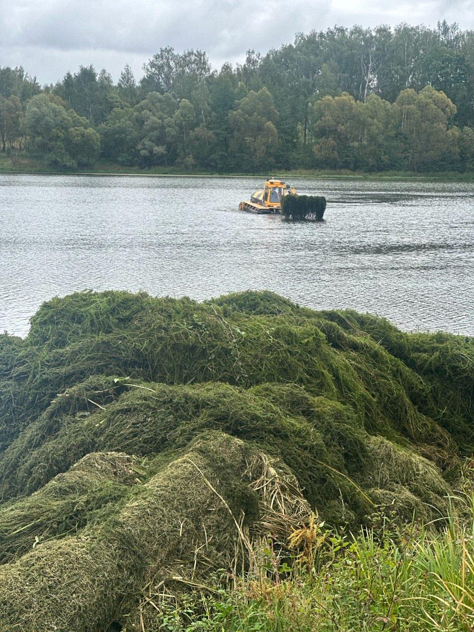Специалисты очищают водную гладь озер от плавающей водной растительности, окашивают камыш, поднимают со дна и отправляют на утилизацию строительный и бытовой мусор, а также удаляют по берегам водоемов аварийно-опасные деревья.
