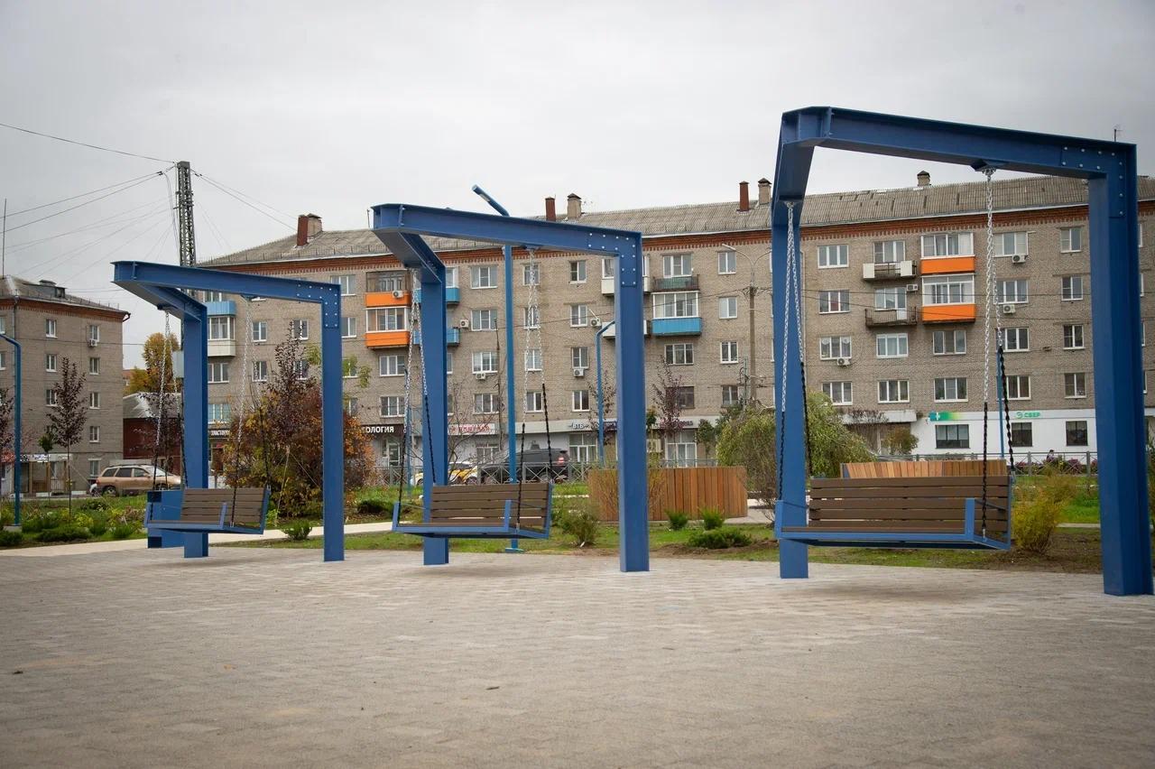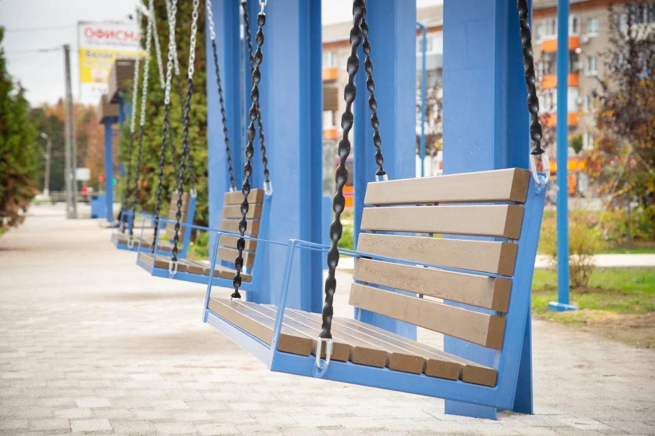 Общественное пространство украсили необычные фотозоны с зеркалами, а также большие подвесные качели с навесами. Для удобства посетителей в сквере проложили пешеходные дорожки, поставили скамейки, а также оборудовали освещение и видеонаблюдение.