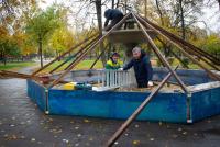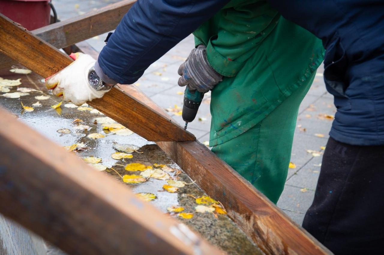 После завершения этапа подготовительных работ специалисты накрыли чашу фонтана деревянной конструкцией, чтобы защитить оборудование от повреждения зимой.
