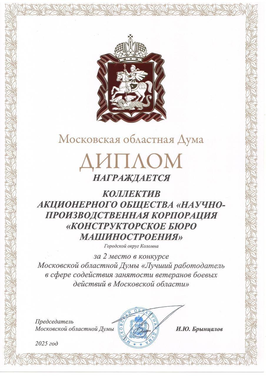 В конкурсе «Лучший работодатель в сфере содействия занятости ветеранов боевых действий в Московской области» КБМ заняло II место.