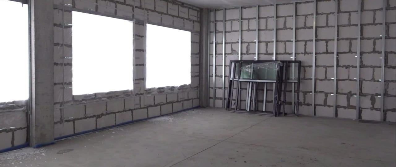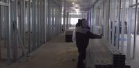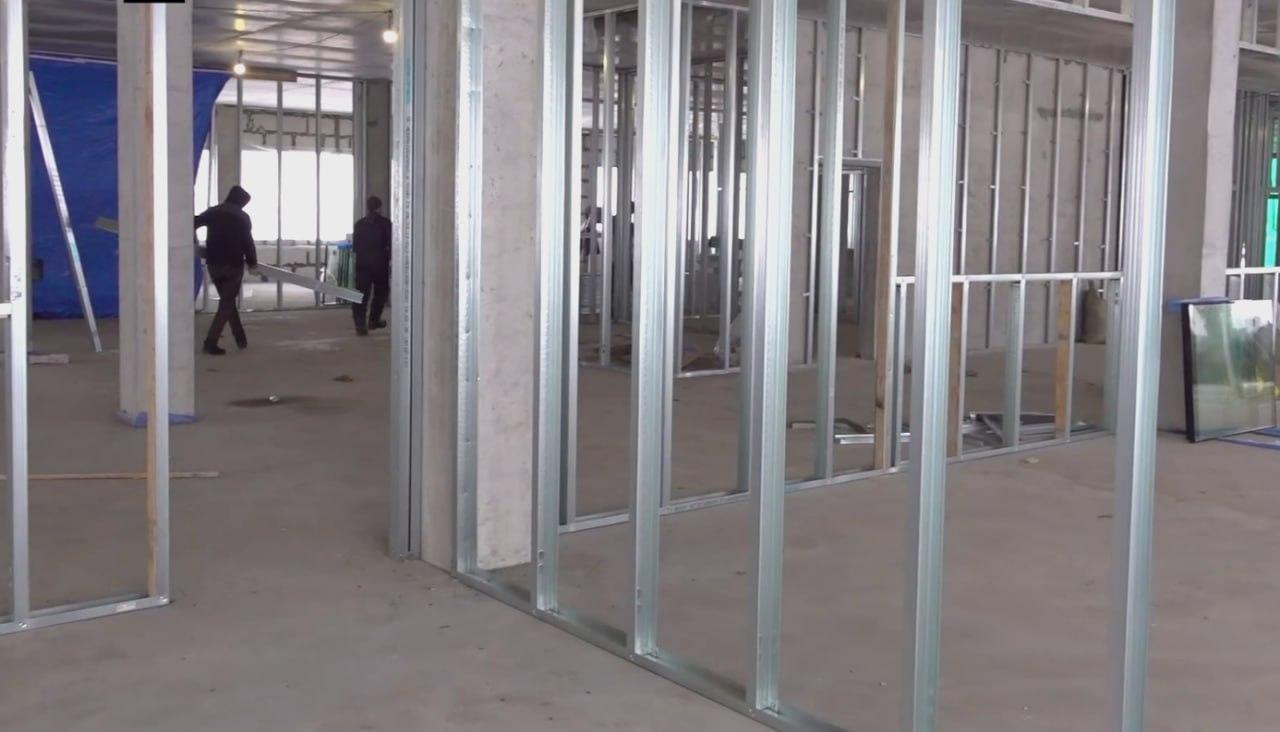 Полностью возведен каркас четырехэтажного здания с цоколем, на первых двух этажах закончена стяжка полов. Подрядчик приступил к выполнению кровельных работ. Одновременно на разных уровнях здания монтируют металлические каркасы для будущих стен между кабинетами, устанавливают стеклопакеты в оконные проемы. Параллельно строятся основания для входных групп.