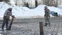 На стройплощадке в Озерах завершены все основные подготовительные мероприятия: полностью выполнены земляные работы, обустроено основание из бетона и проведена гидроизоляция фундамента. Текущие строительные процессы сосредоточены на создании монолитной плиты фундамента: рабочая бригада ведет монтаж армирующего каркаса и установку специальных элементов для последующей прокладки инженерных сетей.