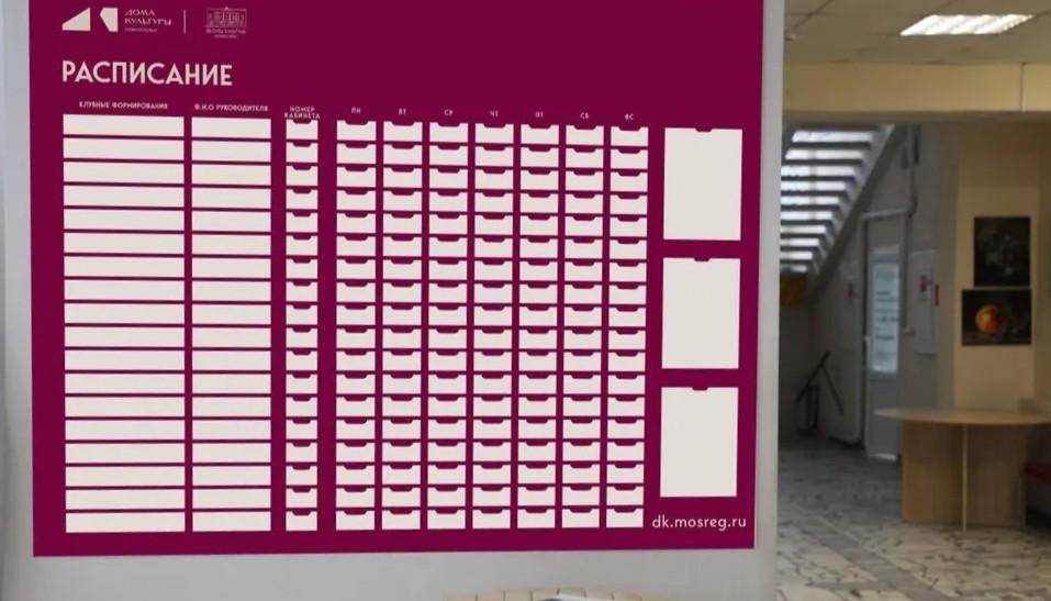 Уже разработан макет информационного стенда с расписанием занятий клубных формирований в фирменном стиле «Дома Культуры Подмосковья». Это первый шаг к созданию единого визуального облика Дворца, который будет узнаваем для всех посетителей. В соответствии с брендбуком проекта, стенд выполнен в современном дизайне, сочетающем эстетику и функциональность.