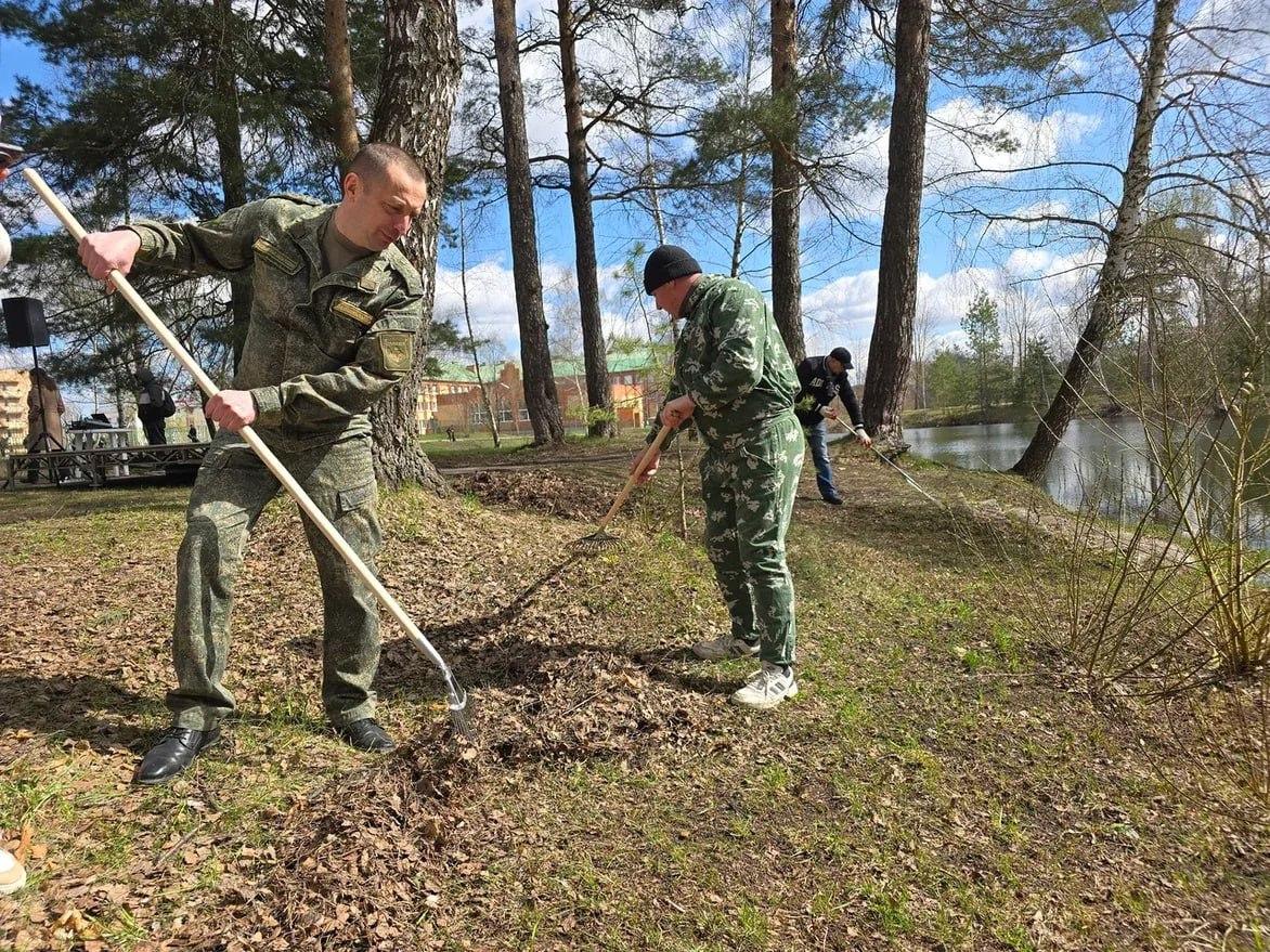 Каждого из участников снабдили необходимым инвентарем и атрибутикой с символикой мероприятия - футболками и кепками, а после работы всех пригласили угоститься сладким горячим чаем и солдатской кашей из полевой кухни.