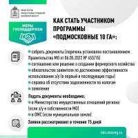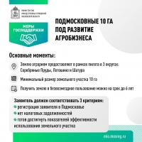 «Областная программа "Подмосковные 10 гектаров" - это пилотный проект, который реализуется лишь в трёх округах. Для нас важно понять, насколько он востребован, и, если эксперимент удастся, то земли будем предоставлять и в других муниципалитетах. Совершенно бесплатно! Программа касается исключительно наших аграриев, либо действующих и желающих расширить своё производство, либо тех, кто мечтал попробовать себя в сельхознаправлениях, и 10 га для них – это отличный старт», - подчеркнула министр имущественных отношений Московской области Наталья Адигамова.