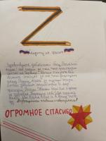 «Здравствуй, доблестный боец российской армии! Хотим сказать Вам большое спасибо за то, что защищаете нашу Родину, борясь за мирную жизнь. Мы гордимся вами, мы верим в вас и в вашу победу», - пишут дети.