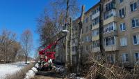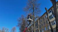 По словам председателя совета дома Надежды Мигдаль, в прошлом году жители обратились в управляющую компанию с просьбой опилить высокие деревья, которые растут вдоль дома. Осенью удалось обработать только пару деревьев с торца, а вот теперь очередь дошла и до фасадной части.