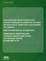 Московский областной пункт отбора бойцов на военную службу по контракту работает в Балашихе по адресу: Восточное шоссе, владение 2. Подробная информация о работе центра доступна на горячей линии: 8 (495) 990-77-77.